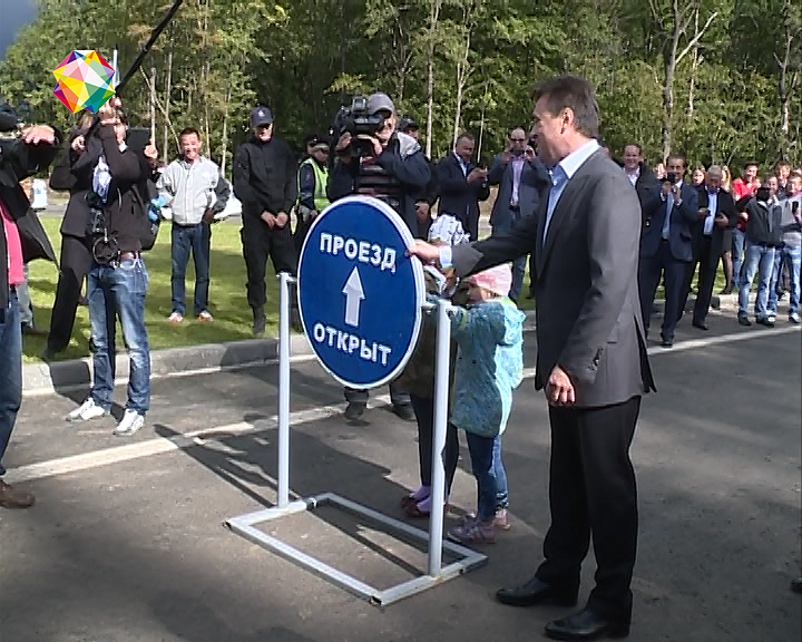 Вместо перерезания ленты было символическое переворачивание знака. Затем на новую трассу вышла колонна автотранспорта. Всё происходило почти как на военном параде, только вместо танков проехала мирная строительная техника. Шествие продолжили подольские байкеры.