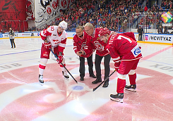 Старт матчу с московским "Спартаком" дали Игорь Угольников и Вячеслав Фетисов, но еще до начала встречи было чем удивить болельщиков. Их, к слову, пришло пять с половиной тысяч. Желающих было гораздо больше, но именно столько смог вместить ледовый дворец.